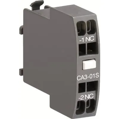 1SBN011019T1001 ABB: CA3-01S is a 1-pole front mounted auxiliary contact block equipped with spring terminals and can be fitted on AS(L)09S…16S contactors and NS(L)...S contactor relays. CA3-01S is available with 1 N.C. instantaneous contacts for standard industrial environments.