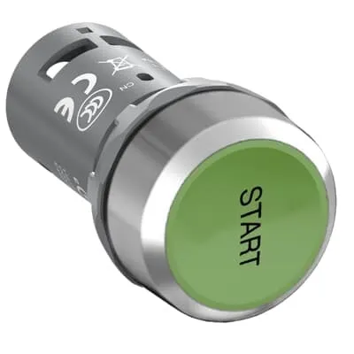 1SFA619199R1107 ABB: This product is compact green monentary pushbutton, 1NO with laser marking "START". The ABB Compact range is the all-in-one solution for simple ordering. It is the most efficient solution available, reducing installation time and cost. The compact range have the highest level of dust and water resistance on the market CP9-1107 is one of many Pushbuttons. The Pushbutton CP9-1107 is Green, Flush, NonIlluminated, Momentary with Chrome Plastic bezel, No lamp and integrated contact system 1NO for 22 mm panel holes. Electrical rating of contacts acc. to IEC 60947-5-1: AC-15 240 V 1 A, DC-13 125 V 0.2 A 24 V 0.3 A. START marking on Pushbutton.