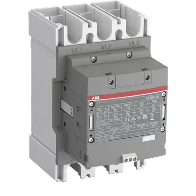1SFL547002R3400 ABB: The AF265-30-00-34 is a 3 pole - 1000 V IEC or 600 V UL contactor with Main Circuit Bars, controlling motors up to 132 kW / 400 V AC (AC-3) or 200 hp / 480 V UL and switching power circuits up to 400 A (AC-1) or 350 A UL general use. Thanks to the AF technology, the contactor has a wide control voltage range (250-500 V 50/60 Hz and DC), managing large control voltage variations, reducing panel energy consumptions and ensuring distinct operations in unstable networks. Furthermore, surge protection is built-in, offering a compact solution. AF contactors have a block type design, can be easily extended with add-on auxiliary contact blocks and an additional wide range of accessories.