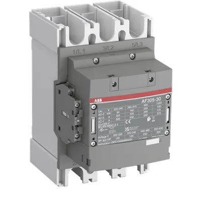 1SFL587002R4322 ABB: The AF305-30-22-43 is a 3 pole - 1000 V IEC or 600 V UL contactor with Main Circuit Bars, controlling motors up to 160 kW / 400 V AC (AC-3) or 250 hp / 480 V UL and switching power circuits up to 500 A (AC-1) or 400 A UL general use. Thanks to the AF technology, the contactor has a control voltage range (220-240 V 50/60 Hz),faster operation time, reducing panel energy consumptions and ensuring distinct operations in unstable networks. Furthermore, surge protection is built-in, offering a compact solution. AF contactors have a block type design, can be easily extended with add-on auxiliary contact blocks and an additional wide range of accessories.