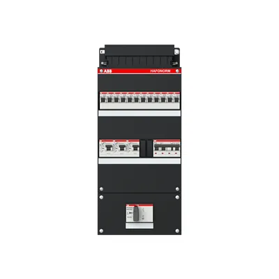 1SPF006905F1768 ABB: Small distribution board equipped Hafonorm 12x behind 3x 30mA = MS + C, 3-phase Main switch in sub box 110x220