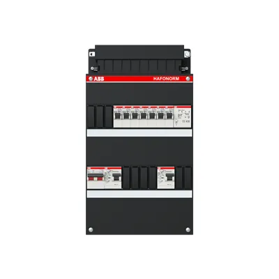 1SPF006907F0189 ABB: Small distribution board equipped Hafonorm MainSw.40A,2xRCD30mA,4+3ways+T,1Ph+N Consumer Unit