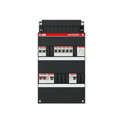 1SPF006907F0322 ABB: Small distribution board equipped Hafonorm MainSw.40A,2xRCD30mA,3+2ways+FT,1Ph+N Consumer Unit