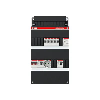 1SPF006907F1184 ABB: Small distribution board equipped Hafonorm MainSw.40A,2xRCD30mA,3+2ways+T,1Ph+N Consumer Unit with 1 socket outlet