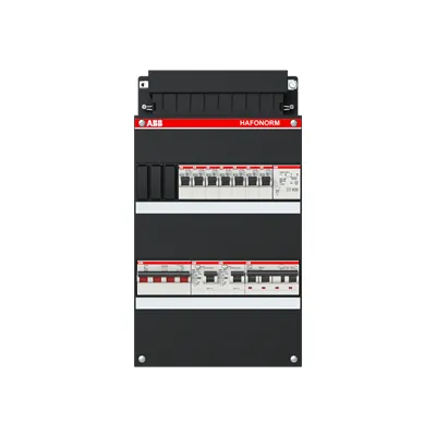 1SPF006907F1729 ABB: Small distribution board equipped Hafonorm 7x behind 2x 30mA + T + MS, + C, 3-phase