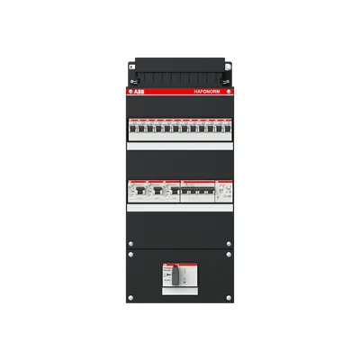 1SPF006907F1771 ABB: Small distribution board equipped Hafonorm 12x behind 3x 30mA = MS + D + T, 3-phase Main switch in sub box 110x220
