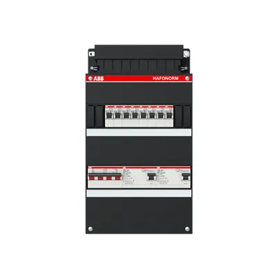 1SPF006909F0252 ABB: Small distribution board equipped Hafonorm MainSw.40A,2xRCD30mA,4+4ways,3Ph+N Consumer Unit