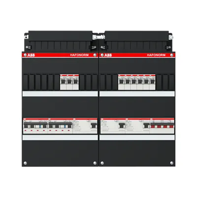 1SPF006972F0010 ABB: Small distribution board equipped Hafonorm 3-phase, main switch 40A 4P 3 RCCB 63A 4P 30 mA 1 RCBO B16 1P+N 30 mA 1 RCBO B16 3P+N 300 mA