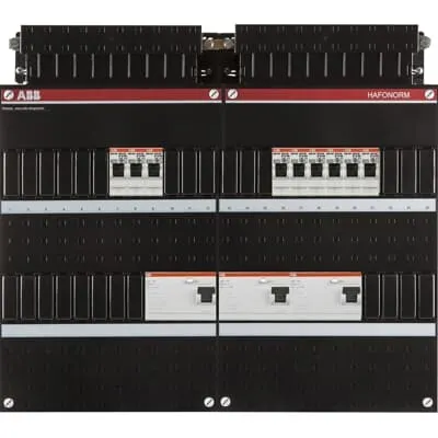 1SPF006972F0011 ABB: Small distribution board equipped Hafonorm 3-phase, main switch 40A 4P 3 RCCB 63A 4P 30 mA 1 RCBO B16 1P+N 30 mA 1 RCBO B16 1P+N 300 mA