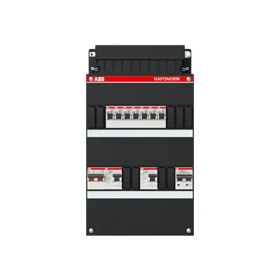 1SPF006972F0018 ABB: Small distribution board equipped Hafonorm 1-phase, main switch 40A 2P 2 RCCB 63A 2P 30 mA, 7 MCB B16 1 RCBO B16 1P+N 300 mA