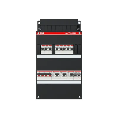1SPF006972F0031 ABB: Small distribution board equipped Hafonorm 3-phase, main switch 40A 4P 3 RCCB 63A 2P 30 mA, 8 MCB B16 1 RCBO B16 1P+N 300 mA