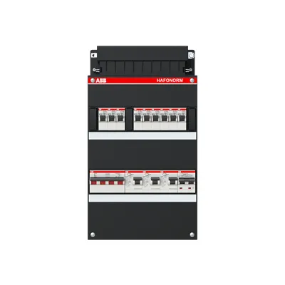 1SPF006972F0032 ABB: Small distribution board equipped Hafonorm 3-phase, main switch 40A 4P 3 RCCB 63A 2P 30 mA, 9 MCB B16 1 RCBO B16 1P+N 300 mA