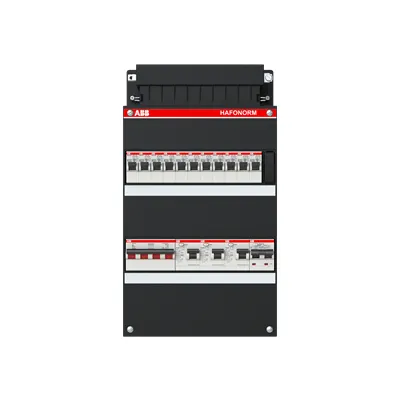 1SPF006972F0034 ABB: Small distribution board equipped Hafonorm 3-phase, main switch 40A 4P 3 RCCB 63A 2P 30 mA, 11 MCB B16 1 RCBO B16 1P+N 300 mA