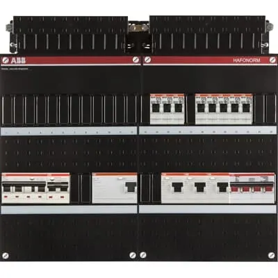 1SPF006972F0045 ABB: Small distribution board equipped Hafonorm 3-ph switch 40A 4P,1 RCCB 63A 4P 30mA 3 RCCB 63A 2P 30mA, 8 MCB B16 1 RCBO B16 3P+N 300 mA 1 RCBO C16 1P+N 30 mA