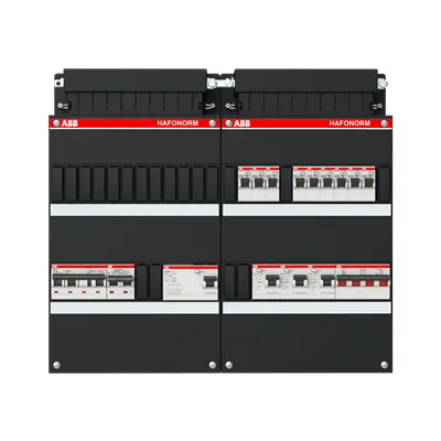 1SPF006972F0046 ABB: Small distribution board equipped Hafonorm 3-ph switch 40A 4P,1 RCCB 63A 4P 30mA 3 RCCB 63A 2P 30mA, 9 MCB B16 1 RCBO B16 3P+N 300 mA 1 RCBO C16 1P+N 30 mA