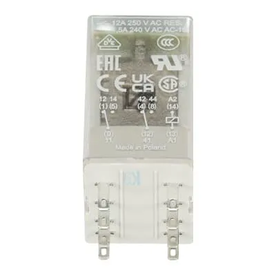 This relay provides 2 c/o SPDT outputs with a rated operational voltage of up to 250 V AC and a current rating of 12 A. The module supports switching of multiple circuits from a single input and is suitable for both AC-12 and DC-12 applications at the specified voltages. Designers can confidently drive actuators, indicators, and alarms within single control points.