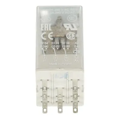 The CR-M230AC3 relay operates with a 230 VAC coil and provides a 3c/o SPDT output. Contacts are rated up to 250 V and 10 A, enabling switching of multiple circuits from a single input signal. This makes it suitable for controlling several sub-circuits in automation panels while maintaining compact form factor.