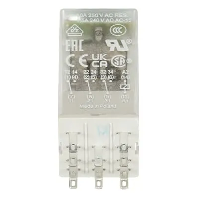 This pluggable interface relay operates with a 110 V AC control supply and provides a 3 c/o SPDT output rated up to 250 V at 10 A. The device supports AC-12/AC-15 operation profiles (230 V 10 A, etc.) and is suitable for light to medium switching tasks in panel workloads. The IP40 rating ensures basic in-panel protection, while RoHS compliance supports environmental responsibilities.