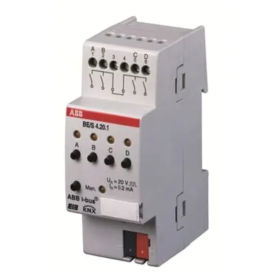 2CDG110053R0011 ABB: The device interrogates 4 floating contacts using an internally generated scanning voltage. The state of the inputs is displayed via 4 LEDs. The binary inputs enable the detection of totally 4 signals (in 2 groups). Each channel has a push button for manual operation. The devices are supplied by the ABB i-bus®, there is no additional power supply neccessary. Bus connection via bus connection terminals.
