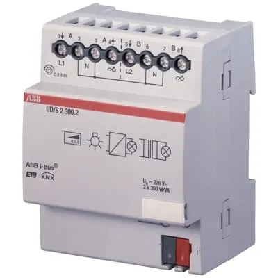 2CDG110074R0011 ABB: For switching and dimming of incandescent lamps, 230 V halogen lamps or low-voltage halogen lamps which are powered by wound or electronic transformers (automatic load detection). Output power 2 x 300 VA or 1 x 500 VA up to 45 °C ambient temperature at a minimum load of just 2 W. Both outputs are independent of one another and can be supplied by different phases. Comprehensive application program with scene and time functions.