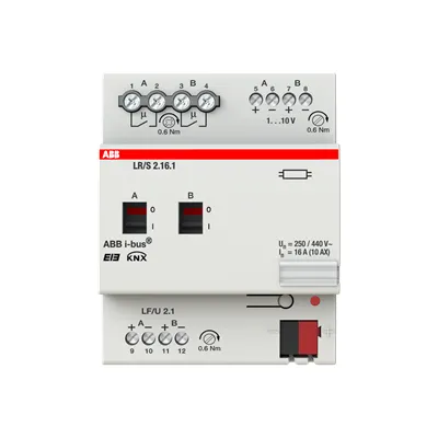 2CDG110087R0011 ABB: Device for switching and dimming two independent groups of luminaries with electronic ballasts (1 – 10 V control input). When combined with the light sensor LF/U 2.1 the device can be used as a 2-fold light controller for constant light control.