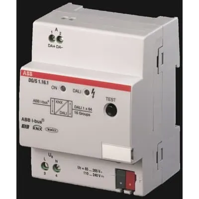 2CDG110103R0011 ABB: DALI Gateway, 1-fold, 16 groups, MDRC For controlling DALI devices via the ABB i-bus®. Up to 64 DALI Slaves are individual addressable. The control and status feedback happens via KNX with 16 lighting groups. Overlapped groups are possible. 14 scenes can be called or stored using 1 bit or 8 bit scene telegram via the KNX. Slave-, staircase- and sequencer- function are integrated. For an individually change of the DALI address or group assignment a separate DGS-Software-Tool is available