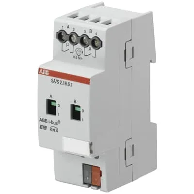 2CDG110112R0011 ABB: Uses potential free contacts to switch 2 independent electrical loads via the ABB i-bus®. Each output has an independent load current detection. Manual operation and display of the switching state of the contacts. The 16/20AX, 16A-AC3 (C-load) device is especially suited for loads with high surge currents e.g. flourescent lighting (AX) acc. EN 60669.