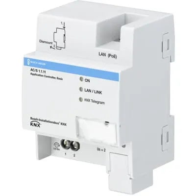 2CDG110205R0021 ABB: Automation Controller with pre-defined Automation Modules for a holistic Heating, Ventilation and Air Conditioning (HVAC) Automation Solution from Central HVAC to Room Automation to meet the Energy Efficiencies Objectives like EN 15232 or LEED. Automation Modules for example Schedule, Set Point Calculation, Heat Curve Calculation, Data Logging and Device Monitoring. Own Automation Modules can be created by a graphical Logic Editor. The Controller has an automatic generated web based User Interface to monitor and manage the KNX System.