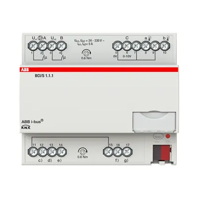 2CDG110222R0011 ABB: As interface between the KNX system and a heat generator or chiller. Via an analog output (0…10V) the set point or set point adjustment temperature can be transmitted to the heat generator/chiller. The set point itself is received via KNX. Via two binary inputs the device can monitor the status of the heat generator/chiller (via potential free contacts) and send it on the KNX bus. A relay output (5A) is included to switch or enable/disable the heat generator/chiller. With an additional relay output (5A) the pump of the heat generator/chiller can be switched on and off. Via 3 binary inputs it is possible to monitor the status of the pump (via potential free contacts) and integrate these feedback into the control of the pump.