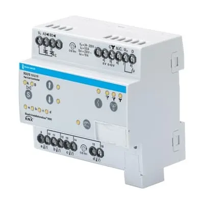 2CDG110235R0021 ABB: For the control of fan coil units. Via two electronic outputs, two thermoelectric or one motor-driven valve drive can be controlled for heating and cooling. For the fan control the devices features an analog output for the control of a continues fan. A relay output switches an additional load of up to 16 A, such as auxiliary heating. Over 4 inputs the room status can be detected and monitored (Use for window contact, dew point sensor, level sensor or temperature sensor). Also it is possible to connect one analog room control unit (SAR/A or SAF/A) to the inputs of the device. The device has an integrated room temperature controller for the control of the room temperature, which can be used directly to control the outputs of the device. The FCC/S 1.5.2.11 features an easy to use manual operation.