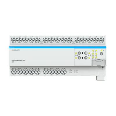 2CDG110249R0021 ABB: The compact 10 A combi switch actuator has 24 independent switching relays. The outputs can be used individually via ABB i-bus® KNX for switching electrical loads or in pairs for controlling 230 V AC roller shutter or blind drives (no electromechanically interlocking). The device features a manual operation, which can also be disabled. Via the manual operation the outputs can be operated manually and the switching or driving status is displayed. The device is powered by KNX and requires no additional power supply.