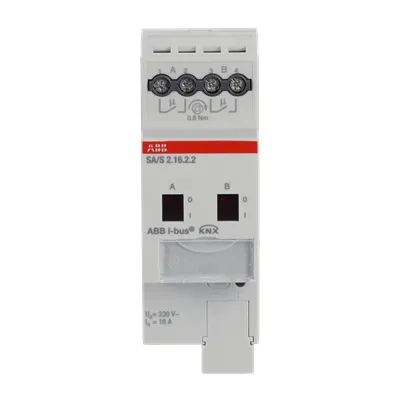 2CDG110261R0011 ABB: The switch actuator uses potential free contacts to switch 2 independent electrical loads via the ABB i-bus®. Manual operation and display of the switching state of the contacts. The 16 A device is especially suited for resistive loads.
