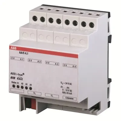 2CDG120005R0011 ABB: The Analogue Actuator has 4 analogue outputs and converts KNX-telegrams into analogue output signals. The outputs are software-parameterized for voltage or current signals. With the Analogue Actuator Module AAM/S the number of analogue outputs can be increased to 8 outputs. The device needs an external 24 V AC power supply, e.g. TS 25/12-24 C (2CSM251043R0811).