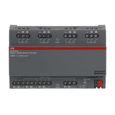 2CDG510007R0011 ABB: Combination device with 8 binary inputs and 8 switch actuators. Conventional push-buttons or auxiliary contacts can be connected to 8 channels.The information of the contact enquiry can be used for activating ABB-free@home® actuators or for recording status information.