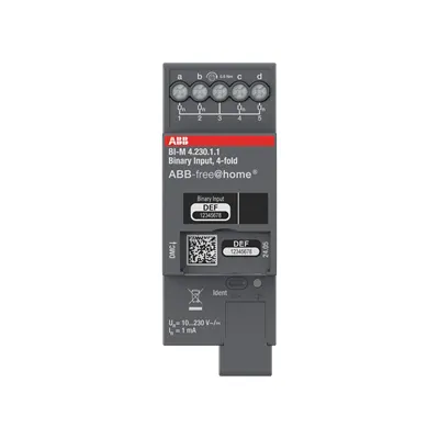 2CDG510016R0011 ABB: Detects AC/DC signals in the voltage range from 10...230 V. The binary inputs enable detection of independent input signals. Each channel can be connected with conventional push-buttons or auxiliary contacts. The information can be used to control free@home actuators or to indicate status information. The devices are powered via the free@home bus and do not require an additional power supply.