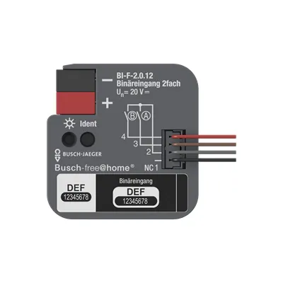 2CDG510023R0021 ABB: 2 channels can be connected with conventional push-buttons or auxiliary contacts. The information of contact scanning can be used to control free@home actuators or for indicate status information. The contact scanning voltage are made available by binary input device. The devices are supplied by free@home bus, there is no additional power supply neccessary. The compact design allows the installation of conventionell 60 mm installation box or device box.