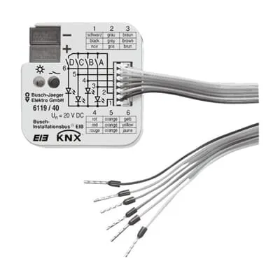 2CKA006133A0151 ABB: Interface with 4 channels as inputs or outputs parameterisable. Connecting cables max. 10 m. Inputs for potential free contacts. Outputs: 5 V max. 2 mA (e.g. LED) For flush-mounted sockets with a depth of 60 mm or also suitable for hollow-wall sockets. Dimensions: 39 x 40 x 12 mm
