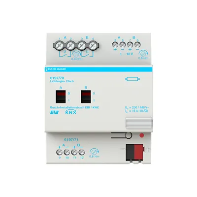 2CKA006151A0208 ABB: 2gang switching-dimmer actuator for dimming 2 ECG groups with 1 - 10 V interface In conjunction with light sensor 6197/71 also as constant light controller (up to 2gang, with 2 light sensors).