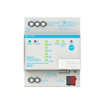 2CKA006180A0029 ABB: With integrated choke and 30 V taken out for supplying another line, e.g. main line via separate choke, connection unit and terminal 6183-101. With diagnosis function for sending of bus current/voltage, operating data, overload, bus reset. Display of bus current used via 7 LEDs. Display LEDs: operation, overload, bus traffic/communication. For generating the system voltage for one bus line. With integrated choke. The bus can be connected via enclosed terminal block.
