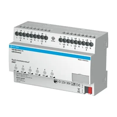 2CKA006197A0048 ABB: Multichannel universal dimming actuator optimised for dimming retrofit LED lamps (LEDi). Also suitable for dimming incandescent lamps, low-voltage halogen lights with conventional or electronic transformers, 230 V halogen lamps and dimmable energy-saving halogen lamps. Automatic load detection (can be deactivated). Separate N-connection per channel. Parallel connection of the outputs possible to increase the output power. Outputs can be connected in parallel in any configuration. Minimum load: 2 W. Manual operation on device also possible without bus voltage or in an unprogrammed status. Programming of the device also possible without applied 230V supply voltage. Extensive test and diagnosis functions for the i-Bus tool. Fast parameter setting in ETS using copyable channel templates. With integrated bus coupler. Nominal power at 230 V~ mains voltage: 230 V~ incandescent and halogen lamps: 6 x 210 W/VA to 1 x 800 W/VA. Dimmable 230 V~ LEDi: 6 x 210 W/VA to 1 x 800 W/VA in trailing edge control, 6 x 80 W/VA to 1 x 240 W/VA in leading edge control. Inductive L-transformers with LED/low-voltage halogen lamp: 6 x 210 W/VA to 1 x 800 W/VA. Electronic C-transformers with LED/low-voltage halogen lamp: 6 x 210 W/VA to 1 x 800 W/VA. Electronic LC-transformers with LED/low-voltage halogen lamp: 6 x 80 W/VA to 1 x 240 W/VA.