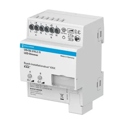 2CKA006197A0052 ABB: Multichannel universal dimming actuator optimised for dimming retrofit LED lamps (LEDi). Also suitable for dimming incandescent lamps, low-voltage halogen lights with conventional or electronic transformers, 230 V halogen lamps and dimmable energy-saving halogen lamps. Automatic load detection (can be deactivated). Separate N-connection per channel. Parallel connection of the outputs possible to increase the output power. Outputs can be connected in parallel in groups. Minimum load: 2 W. Manual operation on device also possible without bus voltage or in an unprogrammed status. Programming of the device also possible without applied 230V supply voltage. Extensive test and diagnosis functions for the i-Bus tool. Fast parameter setting in ETS using copyable channel templates. With integrated bus coupler. Nominal power at 230 V~ mains voltage: 230 V~ incandescent and halogen lamps: 2 x 315 W/VA to 1 x 500 W/VA. Dimmable 230 V~ LEDi: 2 x 315 W/VA to 1 x 500 W/VA in trailing edge control, 2 x 120 W/VA to 1 x 200 W/VA in leading edge control. Inductive L-transformers with LED/low-voltage halogen lamp: 2 x 315 W/VA to 1 x 500 W/VA.