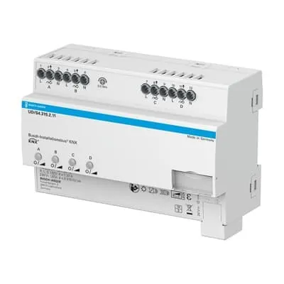 2CKA006197A0056 ABB: Multichannel universal dimming actuator optimised for dimming retrofit LED lamps (LEDi). Also suitable for dimming incandescent lamps, low-voltage halogen lights with conventional or electronic transformers, 230 V halogen lamps and dimmable energy-saving halogen lamps. Automatic load detection (can be deactivated). Separate N-connection per channel. Parallel connection of the outputs possible to increase the output power. Outputs can be connected in parallel in groups. Minimum load: 2 W. Manual operation on device also possible without bus voltage or in an unprogrammed status. Programming of the device also possible without applied 230V supply voltage. Extensive test and diagnosis functions for the i-Bus tool. Fast parameter setting in ETS using copyable channel templates. With integrated bus coupler. Nominal power at 230 V~ mains voltage: 230 V~ incandescent and halogen lamps: 4 x 315 W/VA to 2 x 500 W/VA in trailing edge control, 4 x 120 W/VA to 2 x 200 W/VA in leading edge control. Dimmable 230 V~ LEDi: 4 x 315 W/VA to 2 x 500 W/VA in trailing edge control, 4 x 120 W/VA to 2 x 200 W/VA in leading edge control. Inductive L-transformers with LED/low-voltage halogen lamp: 4 x 315 W/VA to 2 x 500 W/VA. Electronic C-transformers with LED/low-voltage halogen lamp: 4 x 315 W/VA to 2 x 500 W/VA. Electronic LC-transformers with LED/low-voltage halogen lamp: 4 x 120 W/VA to 2 x 200 W/VA.