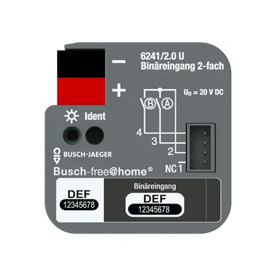 2CKA006220A0004 ABB: Conventional push-buttons or auxiliary contacts can be connected to 2 channels. The information of the contact enquiry can be used for activating ABB-free@home® actuators or for recording status information. The contact polling voltage is made available from the binary input itself. Extension of the connecting cables possible by a maximum of 10 m. Flush-mounted device for installation in a 60 mm device box or distribution box. The bus can be connected via enclosed terminal block.