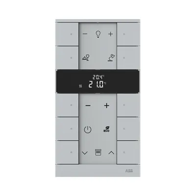2CKA006220A0859 ABB: Control element with room temperature controller function. For controlling commercially available actuating drives in combination with free@home Heating-/Fan-Coil Actuators. With display of set-value and current temperature. For transmitting switching, push-button, dimming and blind commands to an ABB-free@home® actuator. With integrated bus coupler. With labelling field. Number of bus subscribers: 1