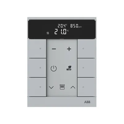 2CKA006220A0860 ABB: Control element with room temperature controller function and CO2/VOC/moisture sensor. For controlling commercially available actuating drives in combination with free@home Heating-/Fan-Coil Actuators. With display of set-value and current temperature. For transmitting switching, push-button, dimming and blind commands to an ABB-free@home® actuator. With integrated bus coupler. With labelling field. Number of bus subscribers: 2