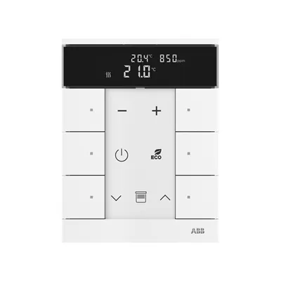 2CKA006220A0872 ABB: Control element with room temperature controller function and CO2/VOC/moisture sensor. For controlling commercially available actuating drives in combination with free@home Heating-/Fan-Coil Actuators. With display of set-value and current temperature. For transmitting switching, push-button, dimming and blind commands to an ABB-free@home® actuator. With integrated bus coupler. With labelling field. Number of bus subscribers: 2