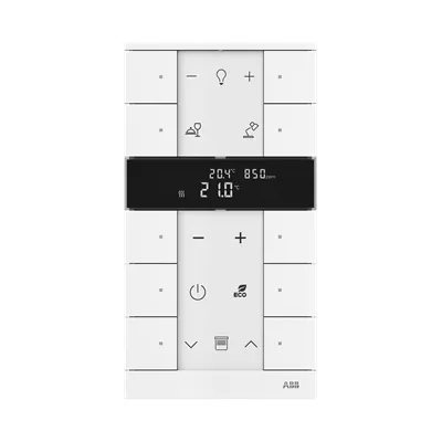 2CKA006220A0873 ABB: Control element with room temperature controller function and CO2/VOC/moisture sensor. For controlling commercially available actuating drives in combination with free@home Heating-/Fan-Coil Actuators. With display of set-value and current temperature. For transmitting switching, push-button, dimming and blind commands to an ABB-free@home® actuator. With integrated bus coupler. With labelling field. Number of bus subscribers: 2
