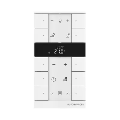 2CKA006220A0895 ABB: Control element with room temperature controller function. For controlling commercially available actuating drives in combination with free@home Heating-/Fan-Coil Actuators. With display of set-value and current temperature. For transmitting switching, push-button, dimming and blind commands to an ABB-free@home® actuator. With integrated bus coupler. With labelling field. Number of bus subscribers: 1