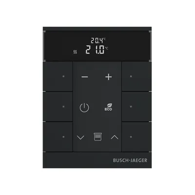 2CKA006220A0900 ABB: Control element with room temperature controller function. For controlling commercially available actuating drives in combination with free@home Heating-/Fan-Coil Actuators. With display of set-value and current temperature. For transmitting switching, push-button, dimming and blind commands to an ABB-free@home® actuator. With integrated bus coupler. With labelling field. Number of bus subscribers: 1