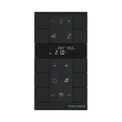 2CKA006220A0903 ABB: Control element with room temperature controller function and CO2/VOC/moisture sensor. For controlling commercially available actuating drives in combination with free@home Heating-/Fan-Coil Actuators. With display of set-value and current temperature. For transmitting switching, push-button, dimming and blind commands to an ABB-free@home® actuator. With integrated bus coupler. With labelling field. Number of bus subscribers: 2